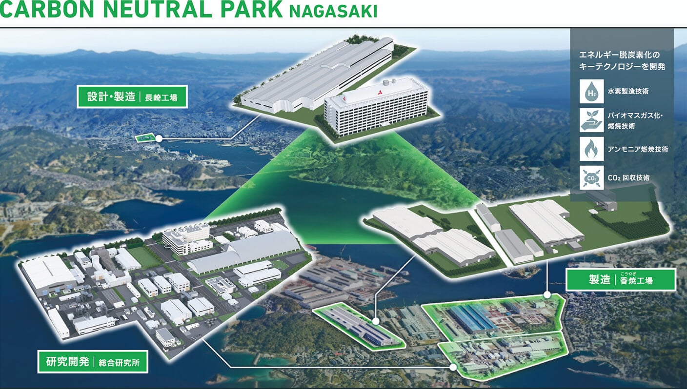 長崎カーボンニュートラルパークは、エネルギー脱炭素化に向けた要素技術を開発する中核拠点として、2023年に長崎造船所および総合研究所長崎地区内で運用を開始しました。