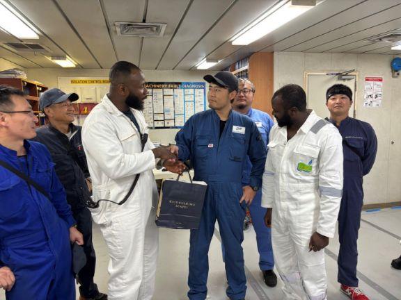 船内作業の中心となる制御室には、乗組員をはじめ、他メーカーの技術者も集まり、連携しながら作業を進めています。乗組員の方々へ長崎のお土産をお渡ししたところ、大変喜んでいただき、和やかな雰囲気の中でコミュニケーションを深めることができました。こうした日常のやり取りが、円滑な作業と良好な関係づくりにつながっていると感じます。